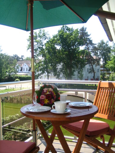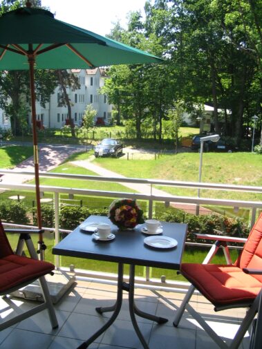 Der zweite Balkon mit Ostausrichtung, ist über das Schlafzimmer zugänglich und bietet den seitlichen Blick in Richtung Ostsee / Kurpark.