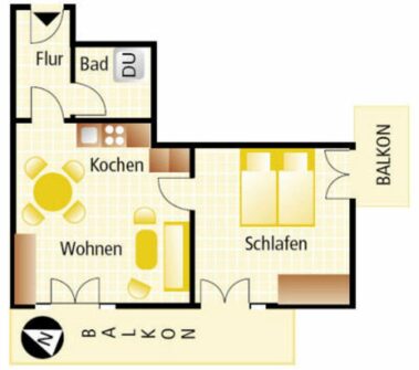 Das ca. 48 m² große Apartment verfügt über einen Flur, ein Badezimmer mit Dusche, eine offene Küche mit Wohn- und Essbereich, ein Schlafzimmer sowie 2 Balkone.